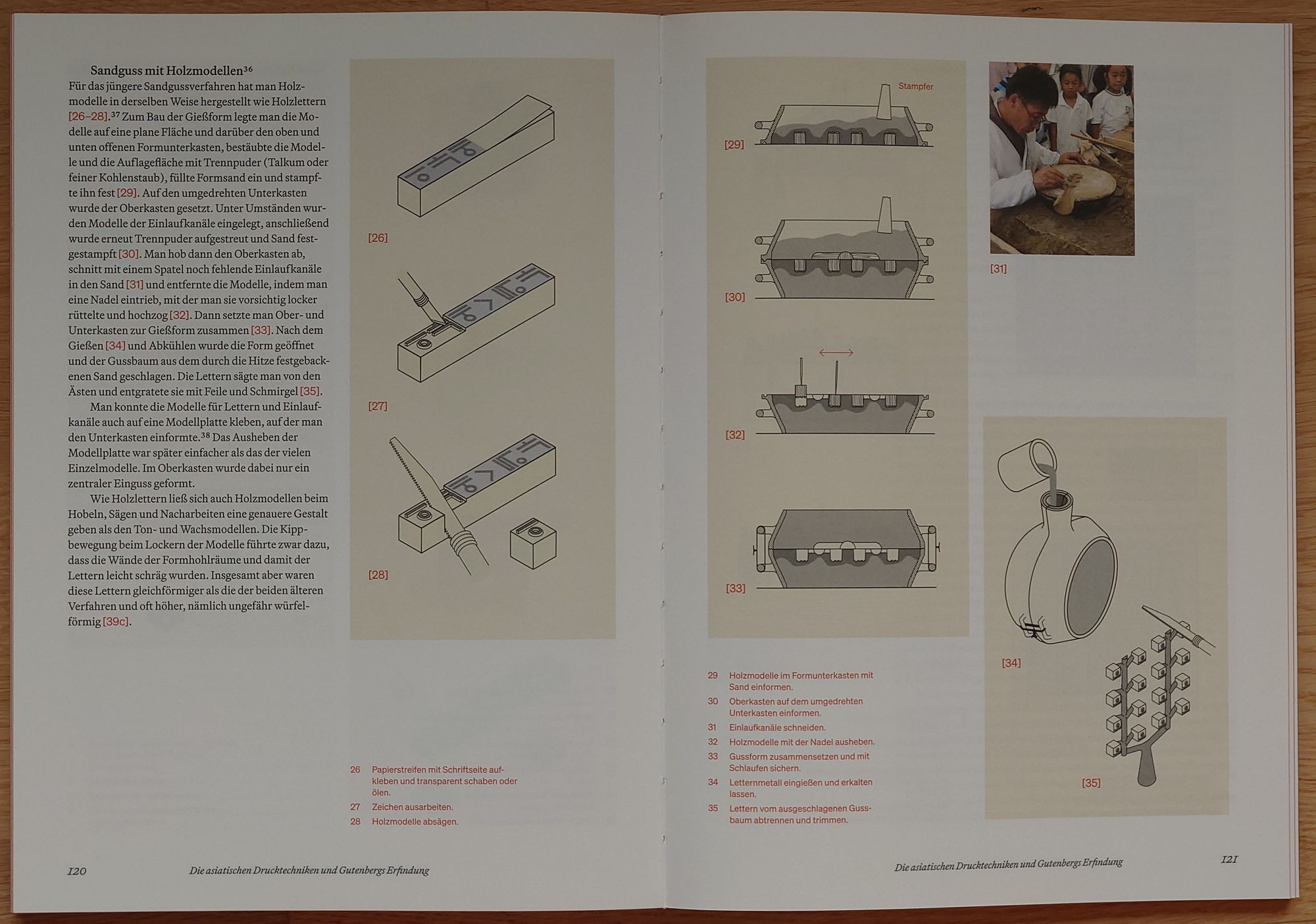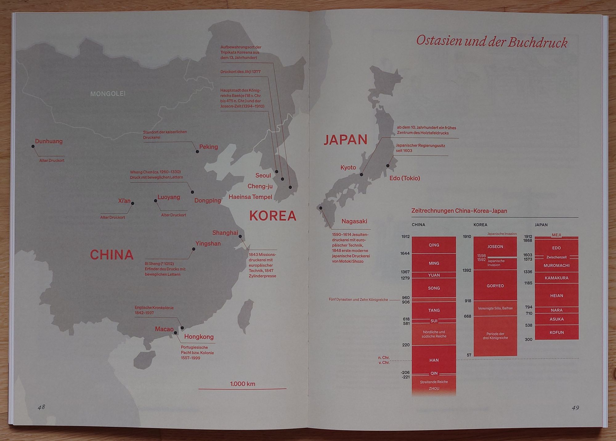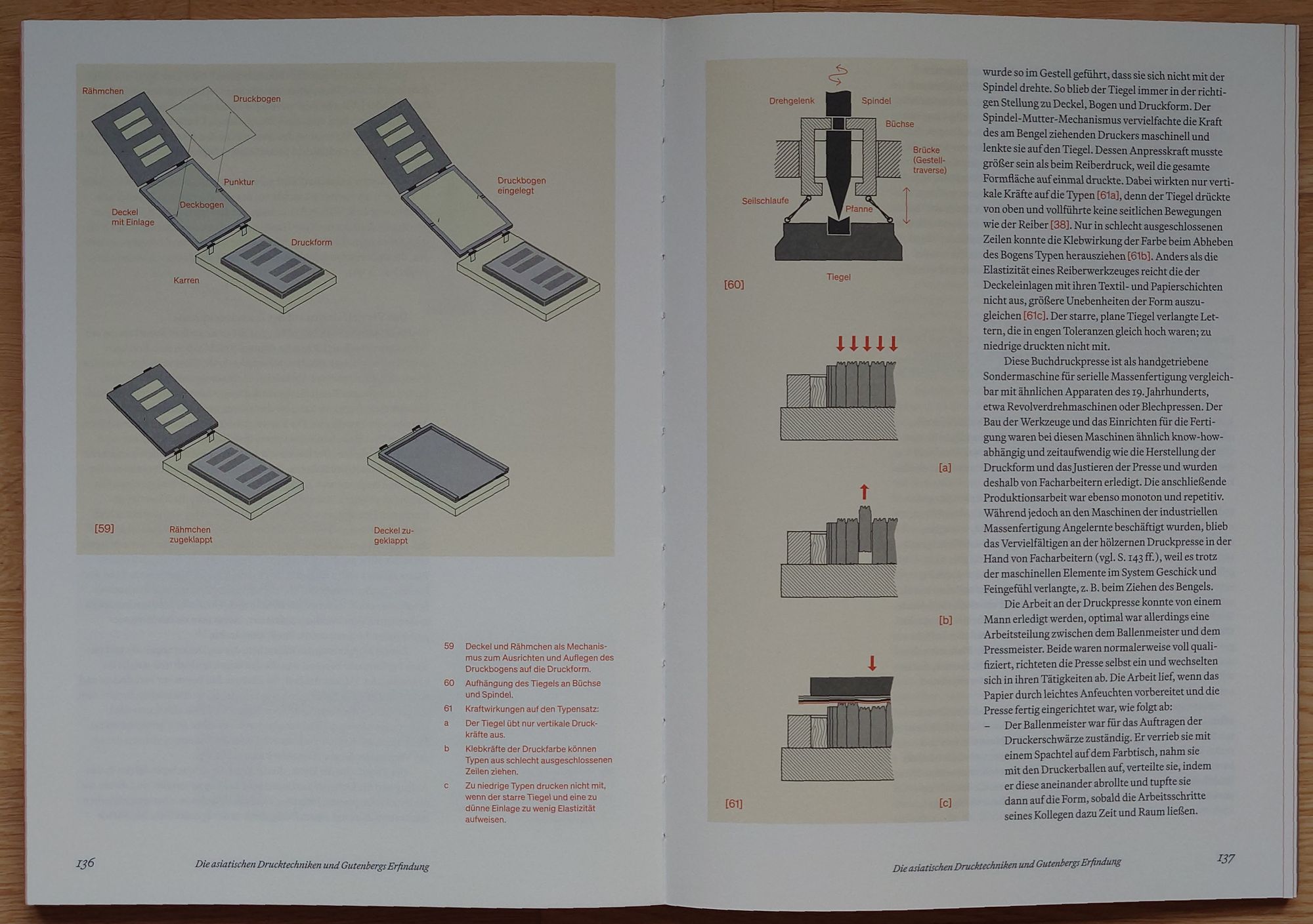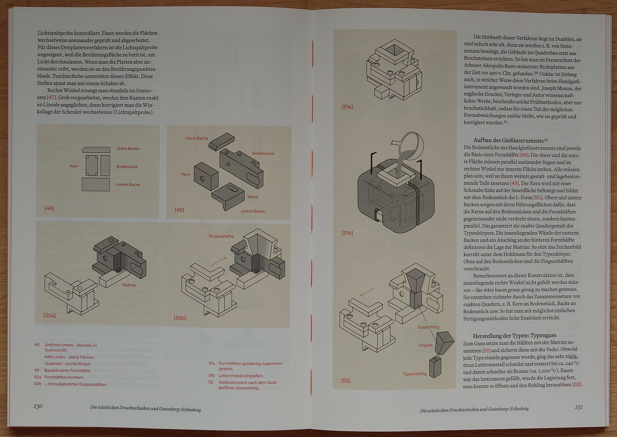 Seit gut sechs Jahren, seit der schönen Ausstellung ›Ohne Zweifel Gutenberg?‹ im Mainzer Gutenberg-Museum 2018/19, wurde auf den Band zur Ausstellung gewartet, sehnsuchtsvoll, denn es gab bis dato keine zusammenfassende Darstellung zu dem hochspannenden Thema in deutscher Sprache. Nun ist dieses überaus schöne und lehrreiche Buch mit dem Titel ›Type. Buchdruck in Europa und Asien‹ endlich erscheinen. Und in welch schöner Gestaltung und Ausstattung! Leicht gefärbtes, sehr angenehm anzuschauendes Werkdruckpapier, zweifarbiger Satz aus der zeitgemäßen Martina Plantijn von Kris Sowersby, sehr anschauliche und informative Graphiken und Illustrationen sowie eine Fadenheftung mit offenem Rücken und farbigem Faden, dadurch sehr gutes Aufschlagverhalten! Was ist wertiger, der Inhalt oder die Gestaltung? Beides passt ausgezeichnet zu einander! Vielen Dank an die Verantwortlichen, an die Gutenberg Stiftung und die Internationale Gutenberg-Gesellschaft in Mainz e.V. als verantwortliche Herausgeber, aber vor allem an die Autoren Cornelia Schneider, Volker Benad-Wagenhoff und Hailian Chen sowie den Gestalter Dan Reynolds!